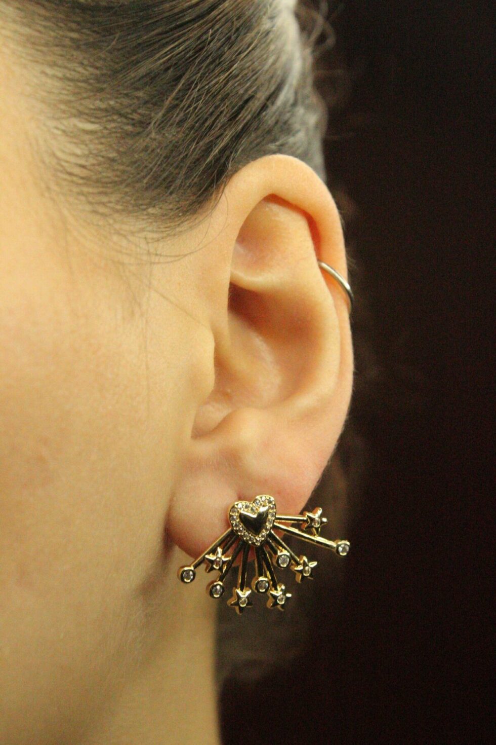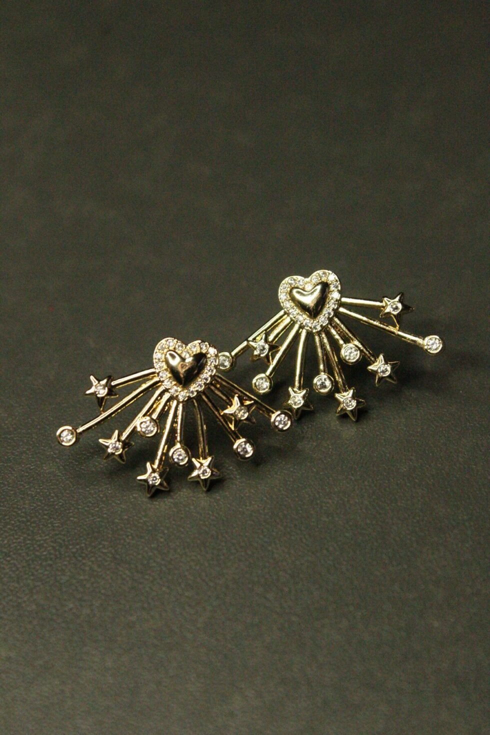 Celestia Heart Küpe, kalpten çıkan yıldızlar gibi, duyguların ışığını stilinize taşıyor.; Taşlarla çevrelenmiş metalik kalp formu, etrafına zarifçe yayılan yıldızlı ışınlarla tamamlanıyor.; Gündelik kombinlerinize romantik bir dokunuş katarken; özel anlarda da dikkat çekici bir detay oluyor.; Glowy Co nun ışıltı, duygu ve ifade üçlemesini kusursuzca temsil eden bu parça, hem genç hem de stil sahibi ruhlara hitap ediyor.
