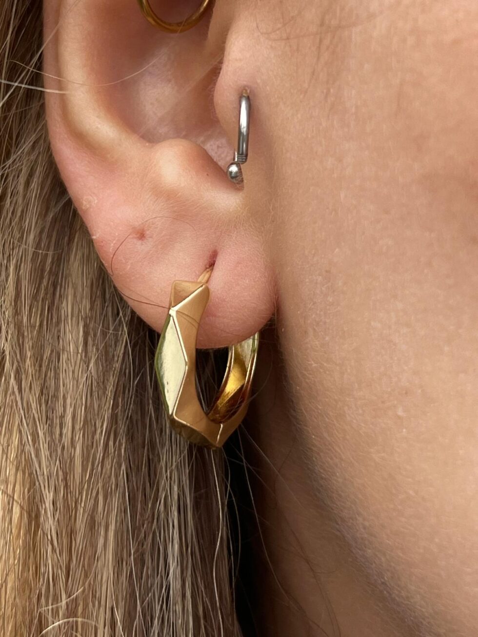 Geometrik Zarafet küpe, modern çizgisi ve güçlü formuyla öne çıkar. Geometrik kesimli tasarımıyla klasik halka küpelere farklı bir dokunuş katar. Altın rengi kaplama kararmaz çelik yapısı sayesinde uzun ömürlüdür, günlük kullanıma ve suya dayanıklıdır. Minimal şıklığı ve modern havasıyla günlük kombinlerden özel davetlere kadar her stile uyum sağlar.