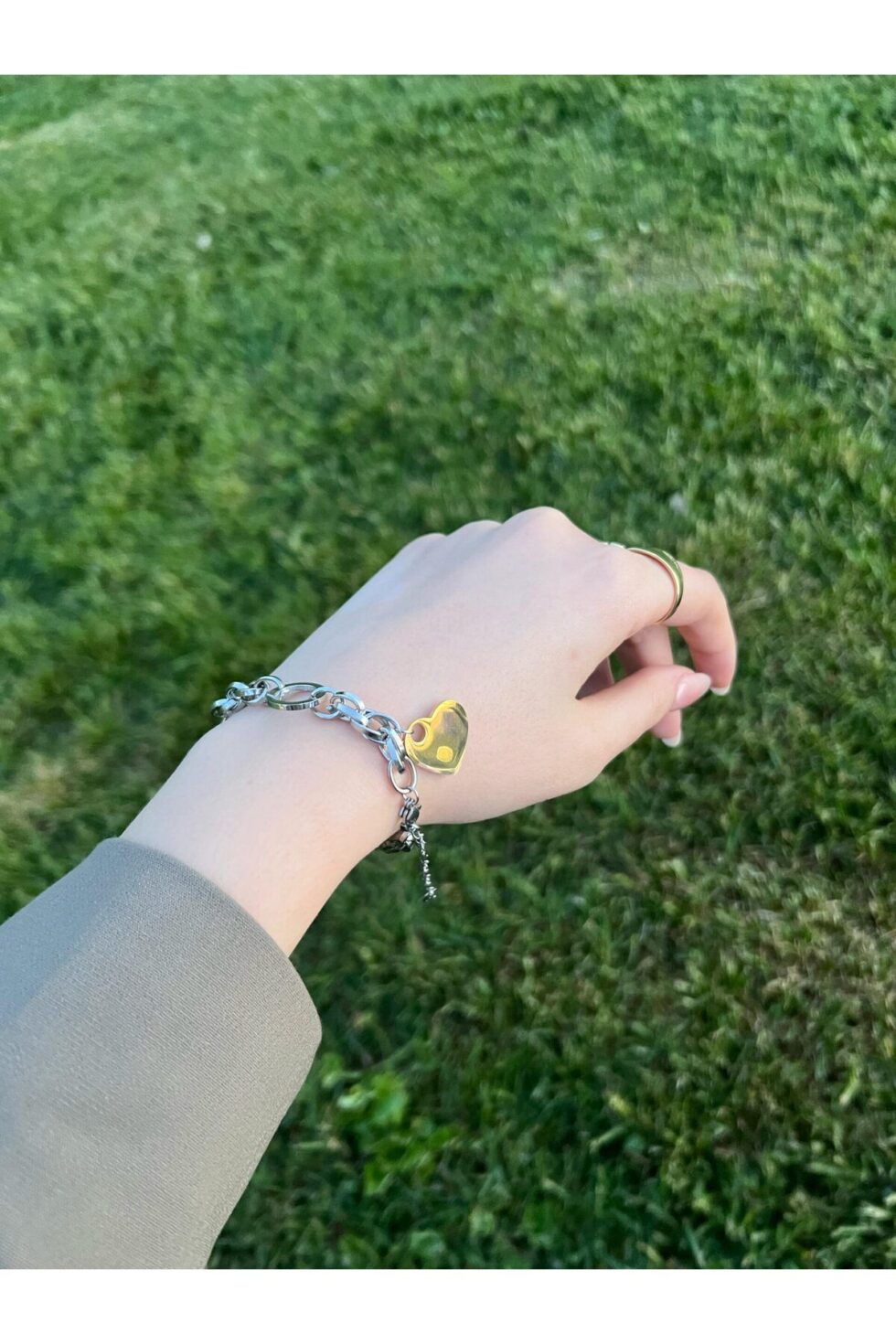 Heart Lock bileklik, kalın gümüş tonlu zincir yapısı ve üzerine eklenmiş altın kalp detayıyla dikkat çeken bir kontrast sunar.; Sert hatlara sahip zincir yapısı, kalbin yumuşak formuyla buluşarak hem güçlü hem duygusal bir tasarım ortaya çıkarır.; Glowy Co’nun cool ama romantik çizgisini yansıtan bu bileklik, ister tek başına ister diğer parçalarla kombinlenerek kullanılabilir.