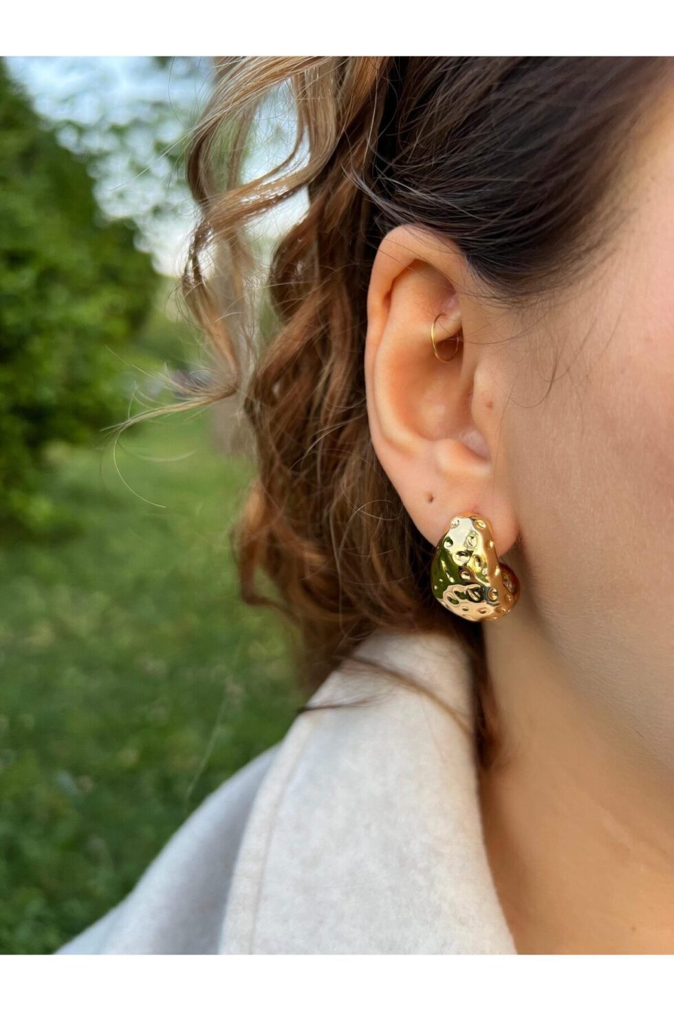 Mira Gold Kararmaz Çelik Küpe, organik formu ve yüzey dokusuyla çağdaş sanatın kulağınızdaki yansıması gibi.; Doğadan ilham alan asimetrik yapısı, klasik altın parlaklığıyla birleşerek dikkat çekici ve özgün bir görünüm sunar.; Kararmaz çelikten üretilmiş olması sayesinde uzun süreli kullanım sunar, alerji yapmaz.; Günlük stilinize modern bir dokunuş katmak veya sade kombinlerinizi öne çıkarmak için mükemmel bir tercihtir.