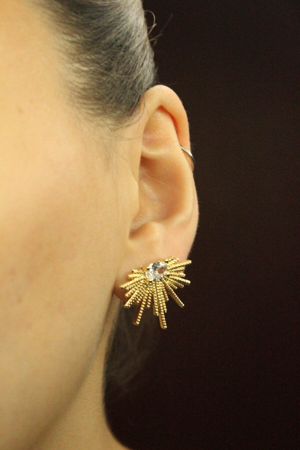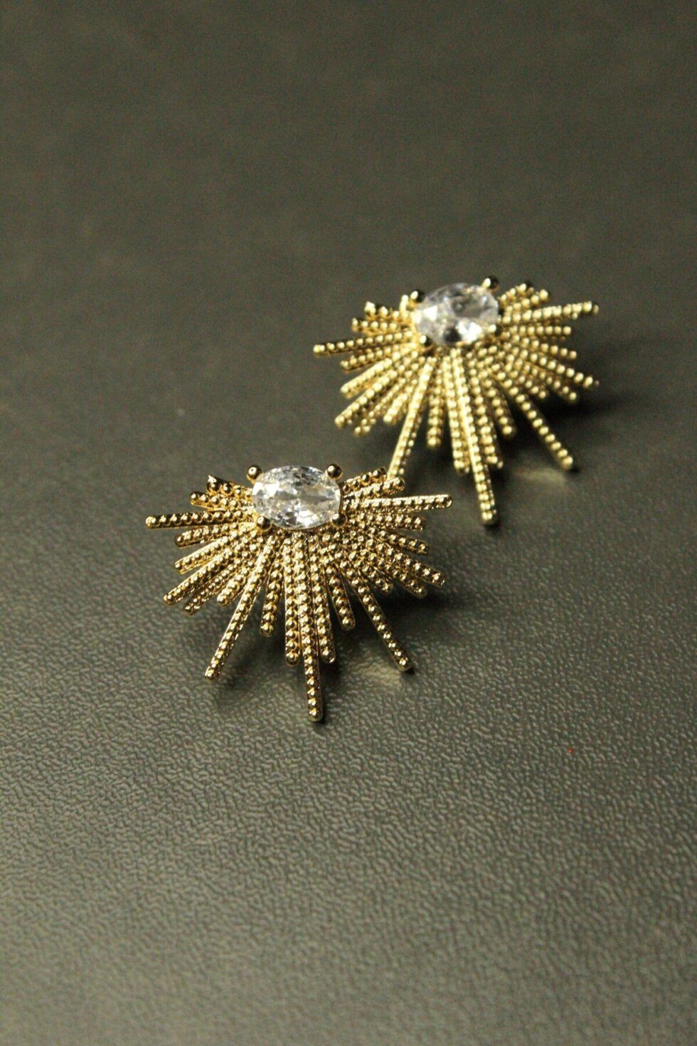 Radiance Gold Küpe, adını yansıttığı ışıltıdan alıyor.; Ortadaki göz alıcı taş, etrafına simetrik olarak uzanan ışın formundaki detaylarla çevrelenerek yıldız etkisi yaratıyor.; Altın tonun sıcaklığı ve zarif dokusu sayesinde hem klasik hem modern stillere kolayca uyum sağlıyor.; Özellikle özel günlerde veya sade kombinleri öne çıkarmak istediğinizde ideal bir tamamlayıcı olan bu küpe, Glowy Co nun cesur ama zarif stilini en parlak haliyle yansıtıyor.