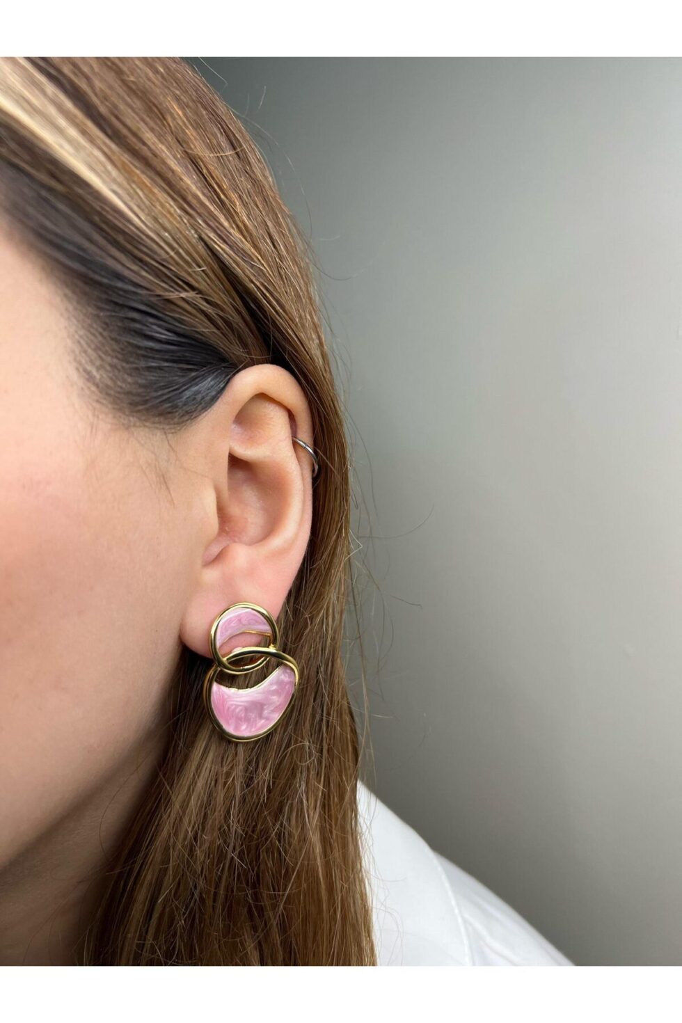 Rosé Swirl Earrings, yumuşak pembe tonların ve altın zarafetin modern bir yorumunu sunuyor.; Organik formu, dalgalı desenleri ve ışıkla değişen etkileyici yansımaları sayesinde her stile romantik ve enerjik bir dokunuş katıyor.; Günlük kombinlerde feminen bir detay arayanlardan, özel günlerinde zarafeti ön plana çıkarmak isteyenlere kadar herkes için mükemmel bir seçim.; Hafif, göz alıcı ve büyüleyici bir tamamlayıcı parça!