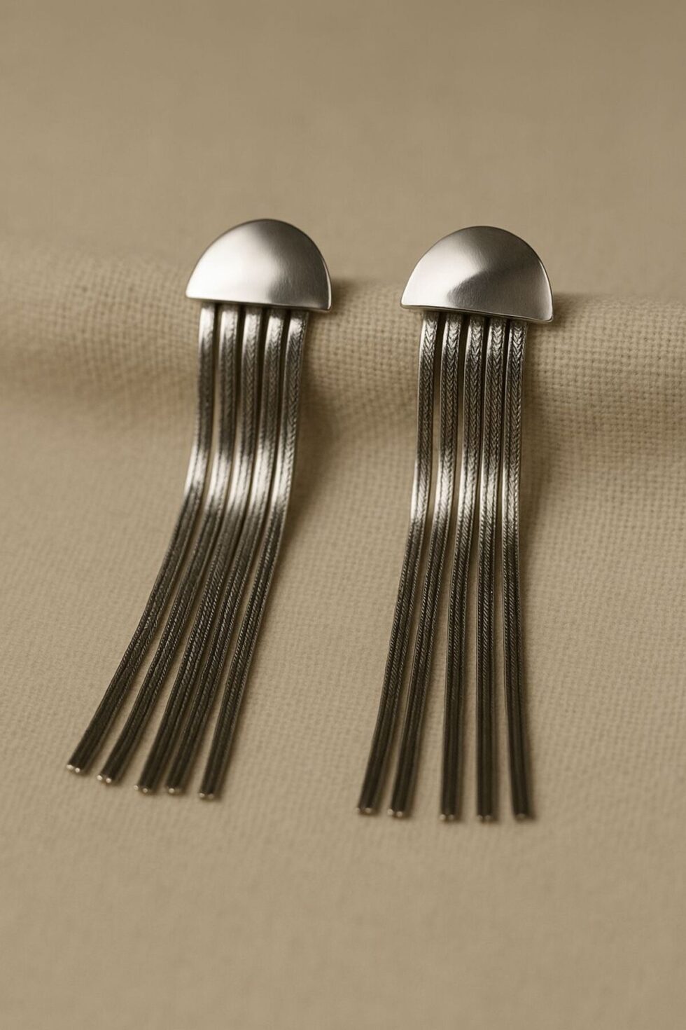 Streamline, hareketin ve sadeliğin bir araya geldiği şık bir tasarımdır.; Yarım daire formlu üst kısmıyla kulakta dengeli dururken, zarif metal iplerin aşağıya doğru akışı bu parçaya dinamizm ve şıklık kazandırır.; Minimalist tarzı benimseyen ama aynı zamanda dikkat çekmek isteyen kadınlar için güçlü bir tamamlayıcı.